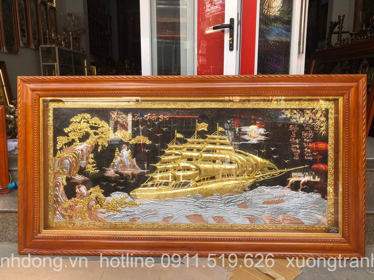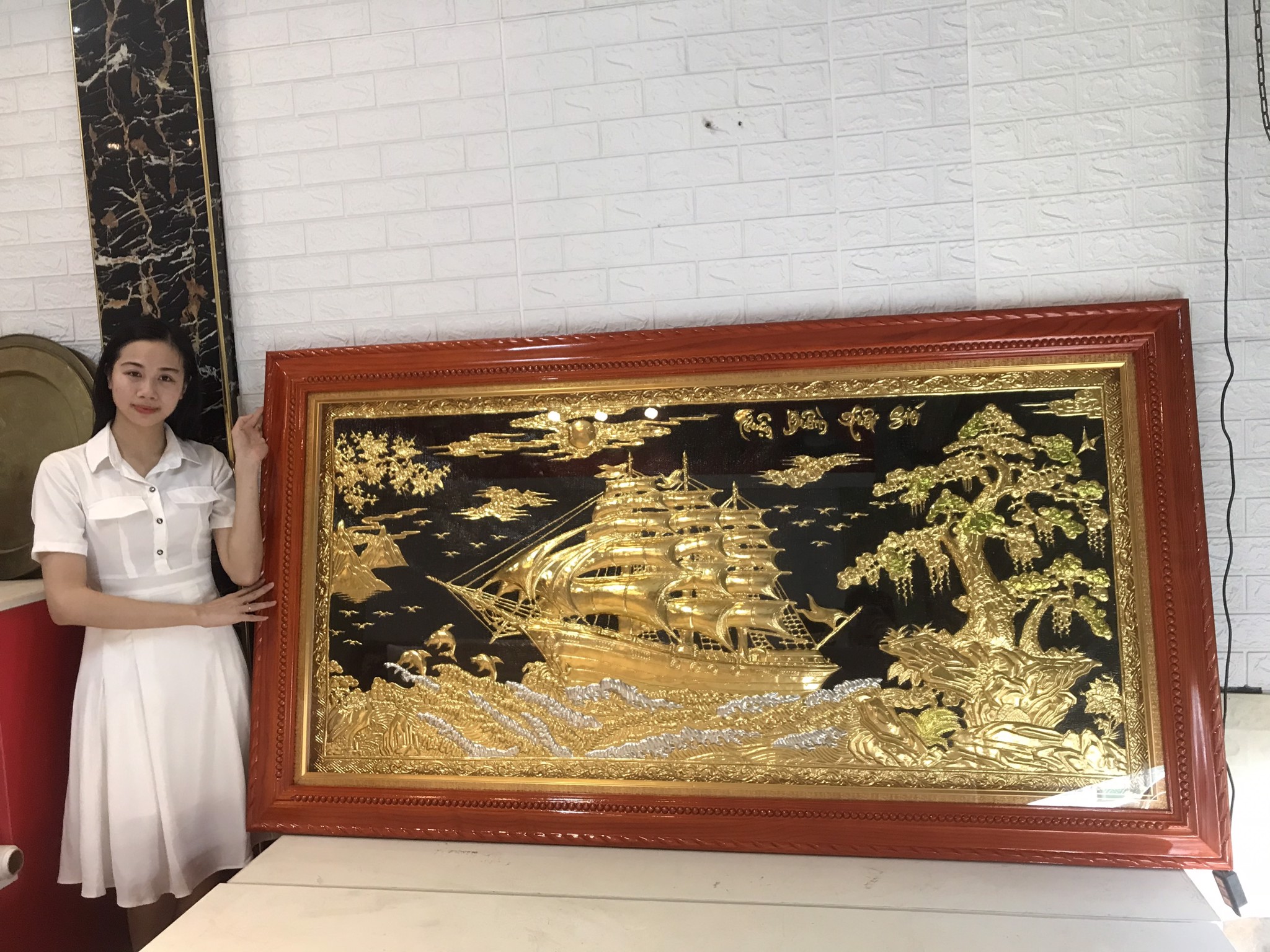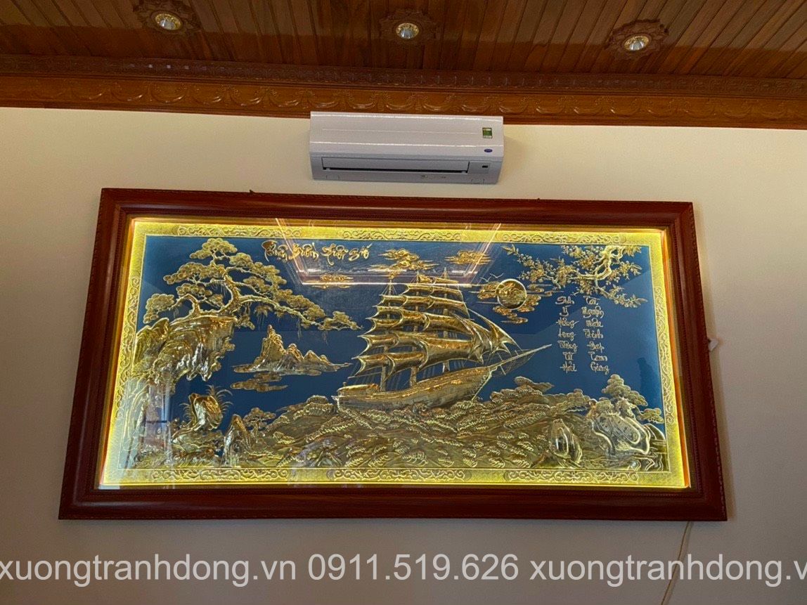 Tranh đồng Thuận Buồm Xuôi Gió dát vàng treo tại phòng khách